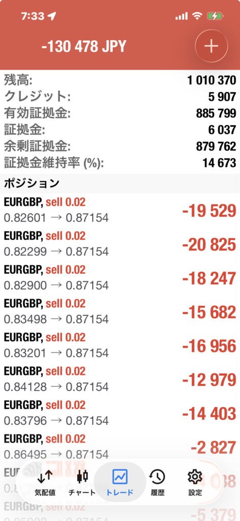 XMでは22/7/4からEUR/GBPのリピート系トレードのEAを稼働させておる。初期投資金額は100万円だ。